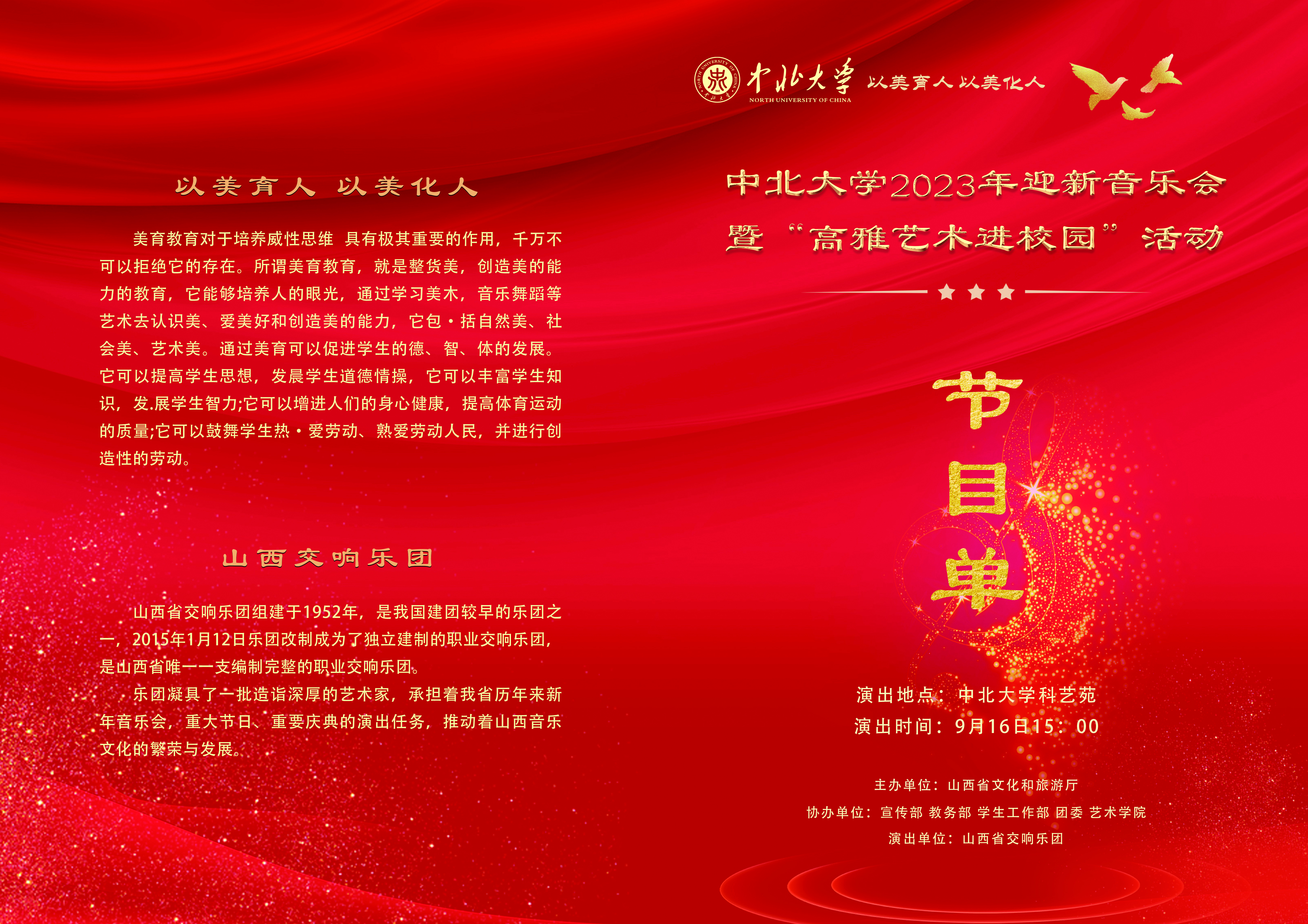 2023年迎新音乐会暨高雅艺术进校园”活动,特邀山西省交响乐团为全校师生进行表演。现诚挚邀请全校师生届时欣赏!