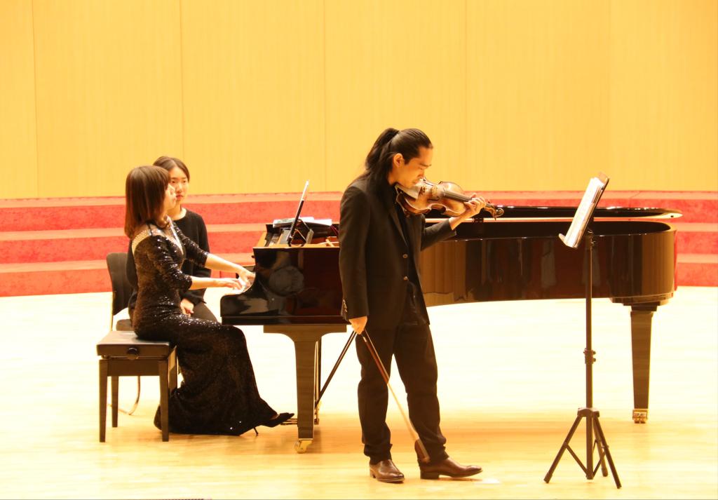 王威龙老师与王琼老师携手演奏了爱德华-格里格(AIEDVRD GREIG)《G大调第二小提琴钢琴奏鸣曲QP13》、郑雨贤《望春风》、莫里斯-拉威尔(MAURICE RAVEL)《G大调第二小提琴钢琴奏鸣曲》、儒勒-马奈斯(JULLES MASSENET)《沉思》和德米特里-肖斯塔科维奇(DMITRI SHOSTAKOVICH)《第一小提琴协奏曲三、四乐章OP.77》,演出一小时二十分钟,一气呵成。弦音激越,琴声悠扬,呈现了一场无与伦比的绝美视听盛宴,现场观众深深沉醉、意犹未尽。
