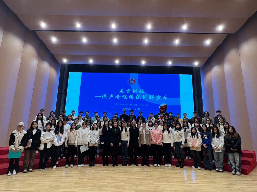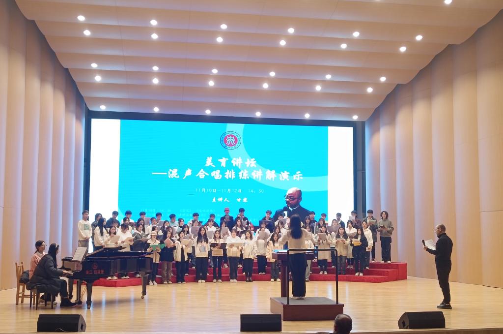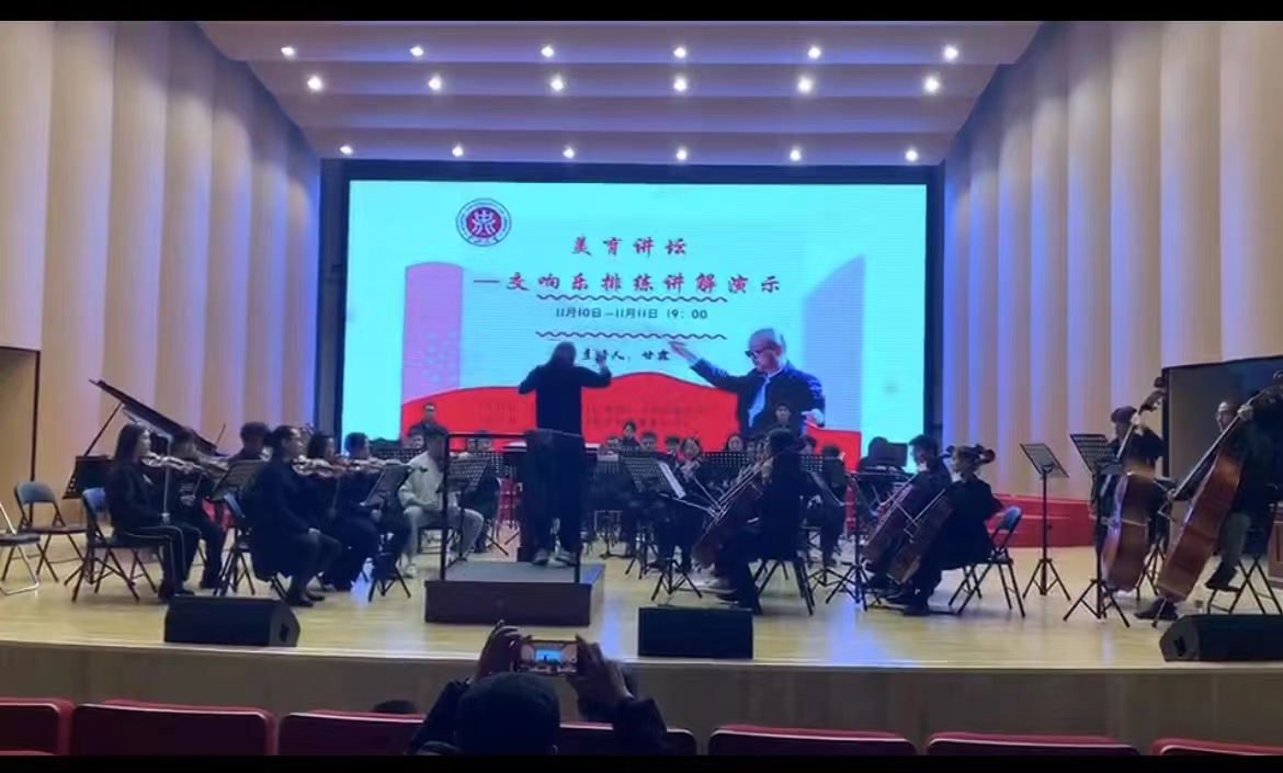 甘霖老师从教育者的角度出发,阐释混声合唱、交响乐的意义——多人多声部在协作中,以享受多声部之间的配合为乐趣的一种艺术形式。甘老师在几天内,共排练了《雪花》、《嘎哦丽泰》、《让世界赞美你》等七首合唱作品、《红旗颂》、《雷电波尔卡》、《匈牙利舞曲第五号》等三首交响乐合奏作品。在排练过程中,他面面俱到,准确地考虑到作品的音准、节奏、用声、速度、力度、乐句、均衡等方面;从分析、理解、发掘和演绎四个层面来处理艺术作品,从而使音乐情感更加细腻,各声部间的变化更为精致。