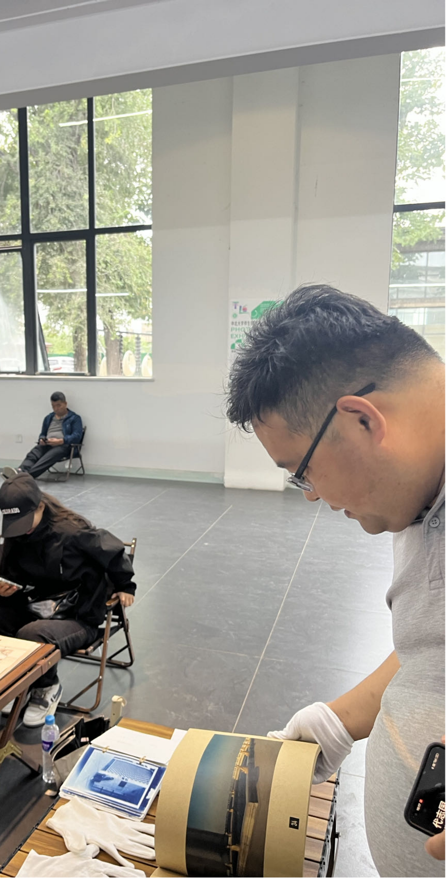 图06 山西省摄影家协会秘书长刘涛先生翻看学生创作的摄影艺术书籍,鼓励明年参加艺术书籍展
