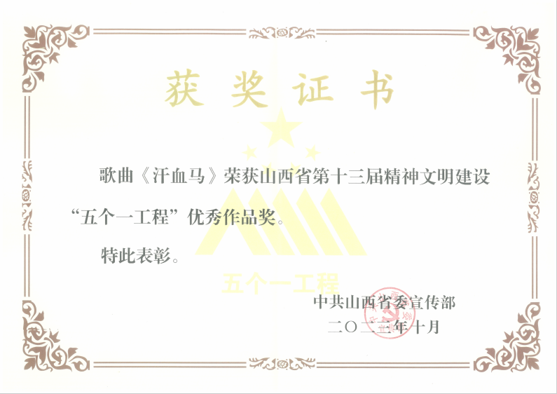 创作歌曲《汗血马》荣获山西省第十三届精神文明建设“五个一工程”优秀作品奖。