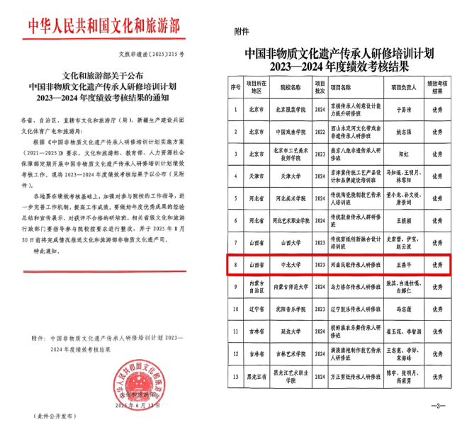 2025年7月,文化和旅游部发布《文化和旅游部关于公布中国非物质文化遗产传承人研修培训计划2023—2024年度绩效考核结果的通知》(文旅非遗函〔2025〕215号)。由山西省文化和旅游厅主办、韩国探花
