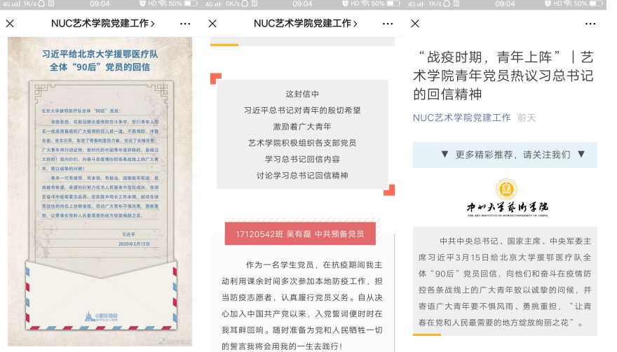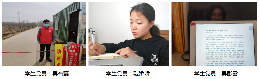 本科生二支部副书记吴有磊同学表示:作为一名90后,我们应该以援鄂医疗队全体‘90后’党员们为榜样,学习他们舍己为人的事迹,无私奉献的精神,勇于担当的品质。自从决心加入中国共产党以来,入党誓词便时时在耳畔回响。随时准备为党和人民牺牲一切的誓言将会用一生去践行!