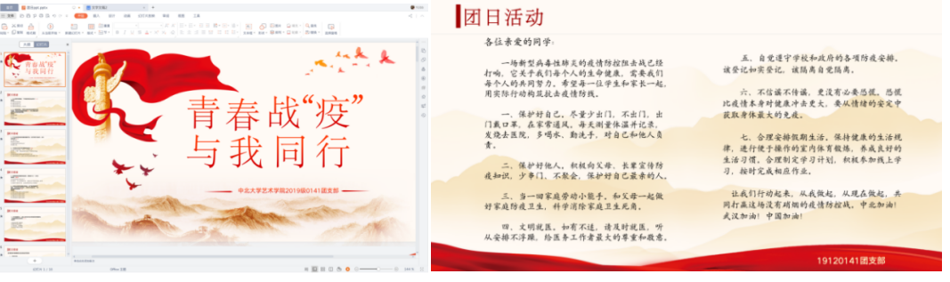 19120341团支部首先开展“学习防疫知识、增强防疫信心”线上学习活动,利用团支部微信群、QQ群等,组织动员团员青年开展防控疫情知识线上专题学习;其次,通过“青年大学习,假期不虚度”自我提升计划,利用团支部微信群、QQ群,创建运动打卡、学习打卡,饮食打卡等多项活动,为团支部成员创造一个监督平台,可以更好的利用假期时间做有意义的事情,不虚度光阴;最后,还进行“中北学子在行动”抗疫作品征集活动,团支部以视频、文字、绘画、书法等多种形式展现疫情面前中北学子的担当与行动,内容包括自己及家人参与防疫志愿活动,为疫区加油、向白衣天使致敬的短视频 ,分享身边的抗击疫情感人故事 ,全国驰援为武汉加油的感人瞬间,感恩父母传承大爱的亲情故事等各类形式多样的作品。