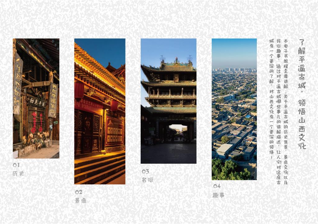 设计说明:作品围绕平遥古城的历史、景点、民俗以及趣事,运用书籍交互的方式,对其进行阐述,其整体风格采用水墨的形式,使其更能突出平遥古城的历史悠久以及强烈的中国味。作品意在通过这样的一个交互让人们能够更好的了解平遥古城,同时带动人们前往平遥古城旅游玩耍,将山西文化传播出去。