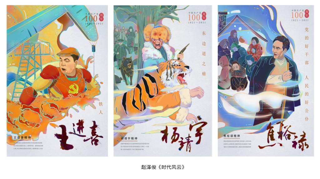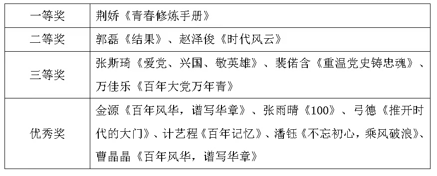 该次党日活动,以不同时期涌现出的李大钊、蔡和森、瞿秋白、杨靖宇、王进喜等一代代优秀共产党人为创作背景,他们是党和国家重要历史瞬间的参与者、是中国共产党的精神之魂、是给予他人光明的璀璨星辰,是有理想信念的追梦人,更是引领当代青年人砥砺前行的精神灯塔,他们用自己的理想和信念托起整个中华民族的伟大复兴。学生们用画笔的力量唤醒红色记忆,重塑坚定信仰,向中国共产党百年华诞献礼。同时鼓励了当代大学生作为新时代的中国青年,要有敢为人先的锐气和开拓进取的气魄。(以下为部分获奖作品展示及明细)