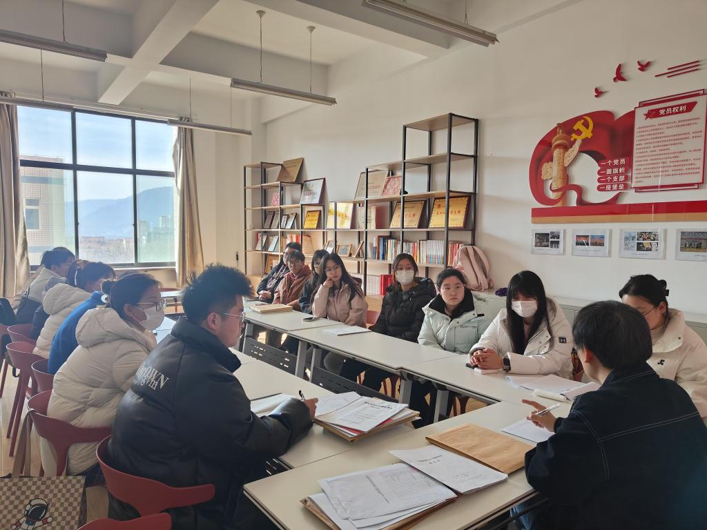 会议伊始,夏老师着重强调了档案完善工作的重要性。要求各培养人全面审查所培养的积极分子、发展对象、预备党员档案,及时查漏补缺。同时,进一步完善工作推进表,明确各项工作的时间节点、工作目标及责任人,提高工作效率与执行力。其次,夏老师提出必须加强意识形态教育,不仅在思想层面引导党员要坚定理想信念,增强“四个意识”、坚定“四个自信”、做到“两个维护”。还要强化安全意识形态,持续推进会前5分钟意识形态教育,意识形态线上教育等工作。此外,夏老师提出本学期要将志愿服务与专业优势紧密结合,创新性开展形式多样、富有特色的志愿服务活动。