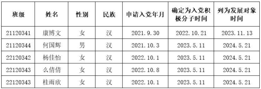 本科生第二党支部于2024年6月7日召开支部委员会,经讨论、表决一致同意拟接收何国辉等5名同志为中共预备党员。现将5名同志的基本情况公示如下:
