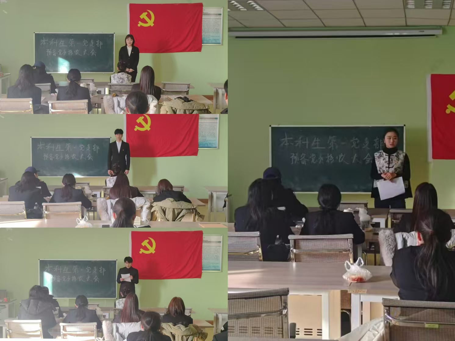 申请人孙艺榕等6名发展对象依次发表了入党的决心,并汇报对党的认识、入党动机、本人履历、家庭成员和主要社会关系情况、现实表现,以及需向党组织说明的其他问题。随后,入党介绍人介绍了6名同志的有关情况,就发展对象的思想、学习、工作以及生活等方面发表评价,并对其能否入党表明意见。支委会向支部大会汇报6名发展对象的培养教育考察情况和政审情况,以及征求党内外群众意见和公示情况。与会党员充分讨论、发表意见,并进行无记名投票表决。经过全体正式党员的认真审议和无记名投票,支部大会最终通过吸纳这6名同志为中共预备党员的决议。