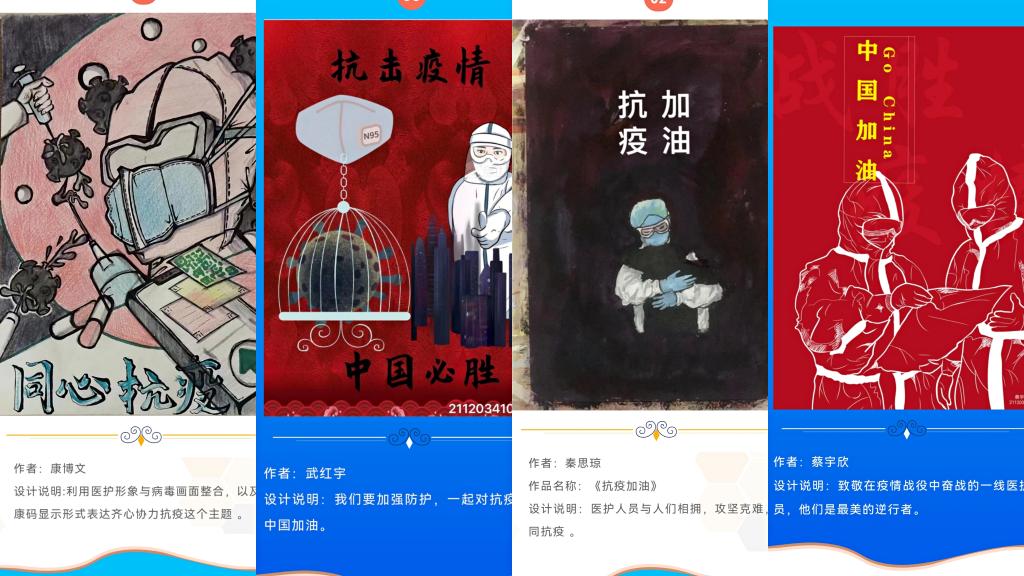 连日来,已收到各种形式投稿四十余幅。同学们以笔为剑,致敬白衣天使、礼赞抗疫英雄、鼓舞战疫士气。作品既生动活泼又温暖人心,得到了师生广泛好评,为坚决打赢疫情防控阻击战贡献了自己的力量。